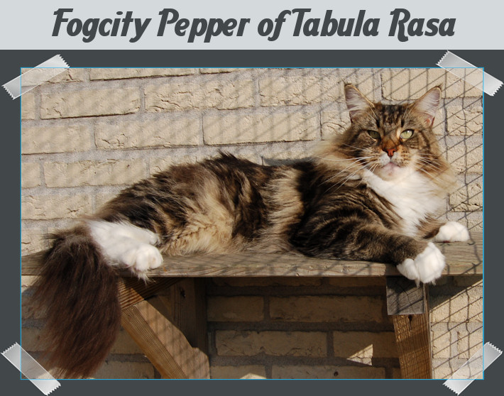 Eindelijk is hij er! Na een leuke trip naar New York is hij met mij mee naar huis gekomen, Fogcity Pepper. Onverwacht toch voor een zwart gemarmerd mannetje gevallen, het is zijn uitstraling waar ik voor gevallen ben! Zijn beide ouders vind ik geweldige katten, mooie stamboom, met prachtige showlijnen met een mooi gebalanceerd type, Pepper lijkt erg veel op zijn vader. Hij heeft een prachtig lang lichaam, een lange staart, een mooie kopvorm met grote oren, ja die hadden wat rechter op zijn koppie mogen staan, maar dat heeft mij niet weerhouden om deze kanjer te nemen. Daarnaast heeft hij een geweldig karakter, hij is verschrikkelijk lief, dat is toch het allerbelangrijkste! Eind 2010 heeft hij met goed gevolg alle gezondheids testen afgelegt en hij heeft ons al een prachtig nestje kittens gegeven, en hopelijk volgen er nog meer!